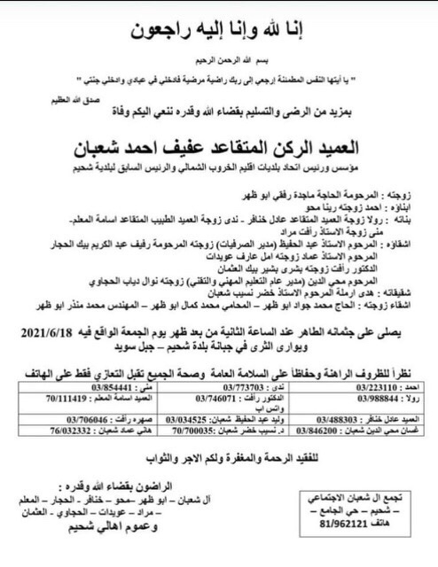 وفاة العميد الركن المتقاعد عفيف احمد شعبان