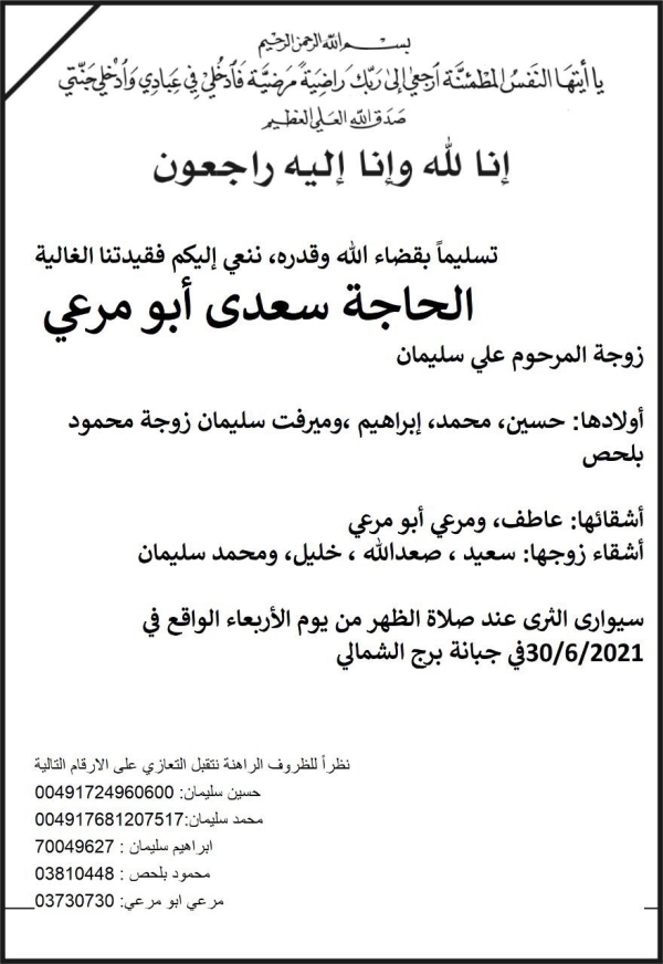 وفاة الحاجة سعدى ابو مرعي