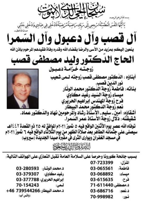 رحم الله الدكتور وليد قصب، صاحب الأيادي البيضاء، وأسكنه فسيح جناته وألهم عائلته ومعارفه ومحبيه الصبر والسلوان، وإنا لله وإنا إليه راجعون.