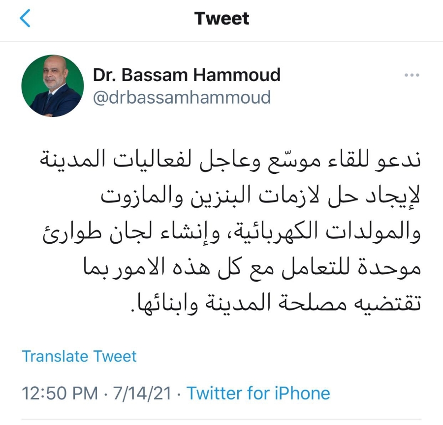 وأضاف: الأزمات التي تتفجر تباعاً بسبب فساد وفشل السلطة والتي كان آخرها موضوع اشتراكات مولدات الكهرباء وتأمين مادة المازوت وما سبقها من أزمة البنزين يضعنا امام مسؤولياتنا لتحصيل حقوق أبناء المدينة، فمدينة صيدا بأنفتاحها واحتضانها للجميع تدفع ثمن جشع وانغلاق بعض البلديات في الجنوب وشرق صيدا الذين يحصرون تعبئة البنزين توزيع المازوت على أبناء بلداتهم او يقومون بتخزينها مما يدفع أعداد كبيرة من أبناء تلك القرى للتوجه الى صيدا مما يؤثر سلباً على حق أبناء المدينة في هذه المواد الحيوية والتي نشاهد يومياً تداعياتها على محطات البنزين ازدحاماً وإشكالات وتضارب وجديدها فقدان مادة المازوت وتوقف عدد كبير من مولدات الكهرباء عن العمل، لذلك فإننا نطالب بحقنا في زيادة حصة صيدا من هذه المواد او التوجه لحصر توزيعها على أبناء المدينة.