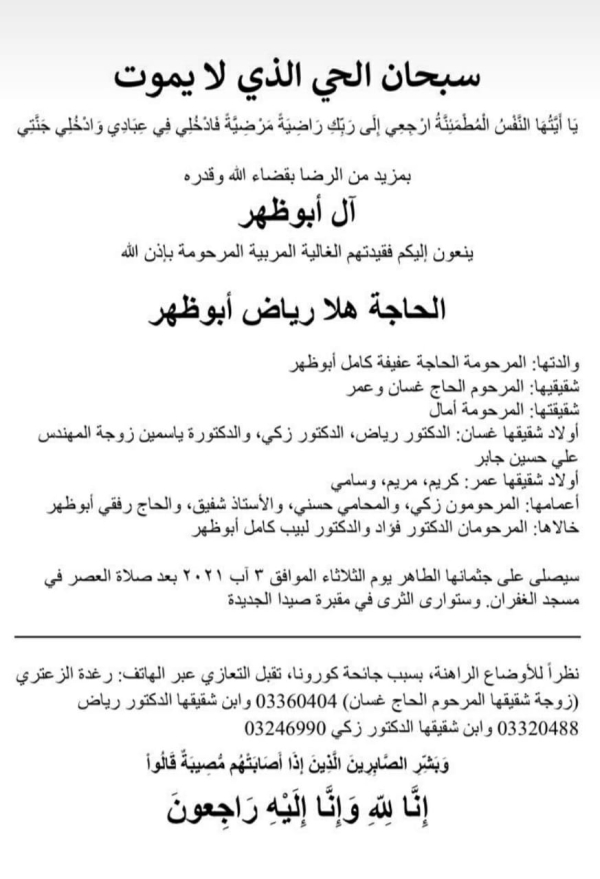 شكر وعرفان لكل من شارك في عزاء والدة القاضي زاهر حمادة