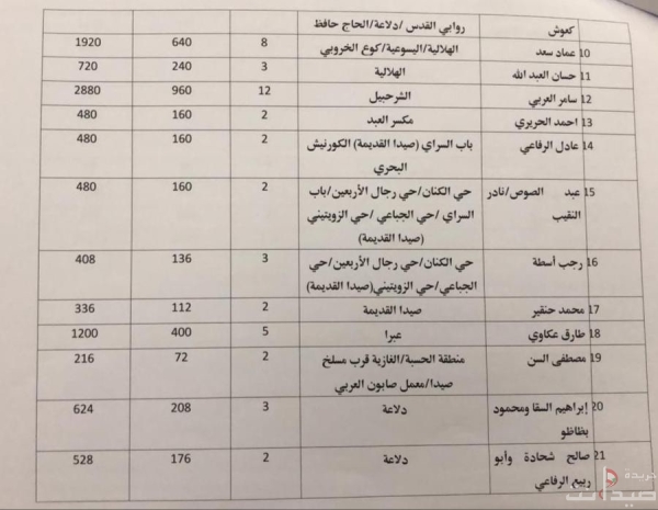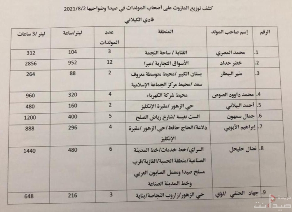 مجموعة كيلاني للمحروقات؛، ننشر جدول توزيع مادة المازوت على شركات مولدات الكهرباء في مدينة صيدا،