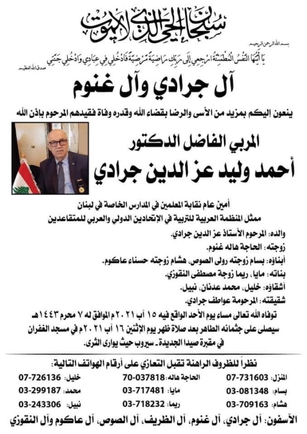 ويتقدم الرئيس السعودي والمجلس البلدي في صيدا بأحر التعازي إلى عائلة المربي الأستاذ جرادي ، وإلى نقابة المعلمين في لبنان، ولجمعية المقاصد الخيرية الإسلامية في صيدا، سائلين الله عز وجل له الرحمة والمغفرة وأن يسكنه فسيح جناته وأن يلهم عائلته ومعارفه ومحبيه الصبر والسلوان. وإنا لله وإنا إليه راجعون