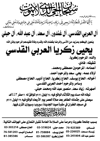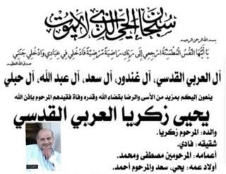 شكر وعرفان لكل من شارك في عزاء والدة القاضي زاهر حمادة
