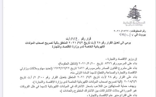ألزم وزير الاقتصاد والتجارة أمين سلام أصحاب المولدات الكهربائية الخاصة وعلى نفقتهم، بتركيب عدادات الكتروميكانيكية للمشتركين لديهم، على أن تكون مطابقة للشروط المحددة في المادة الثانية من القرار رقم 100 المذكور في القرار، وذلك خلال مهلة شهر واحد من تاريخ نشر هذا القرار.