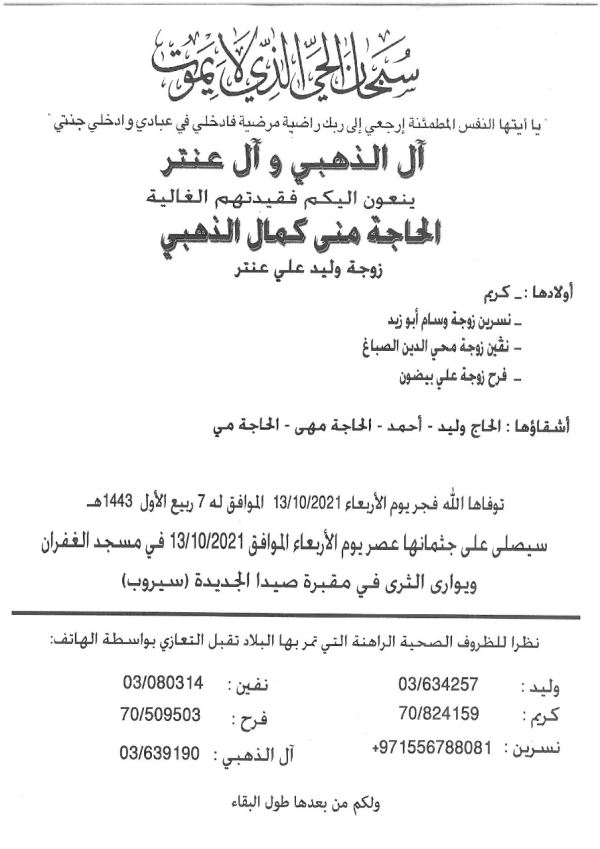 يصلى على جثمانها عصر اليوم الأربعاء في مسجد الغفران وتوارى الثرى في مقبرة صيدا الجديدة في سيروب.