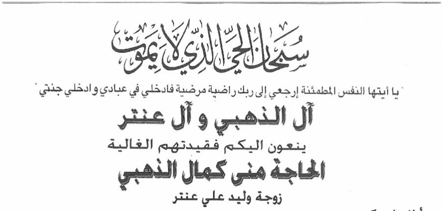 غيب الموت الحاجة منى كمال الذهبي حرم الزميل وليد عنتر بعد صراع طويل مع المرض.