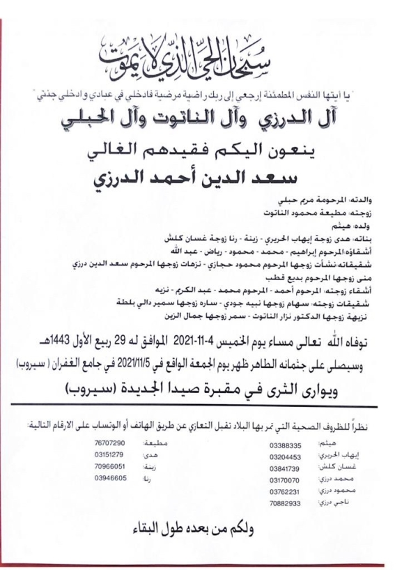 شكر وعرفان لكل من شارك في عزاء والدة القاضي زاهر حمادة