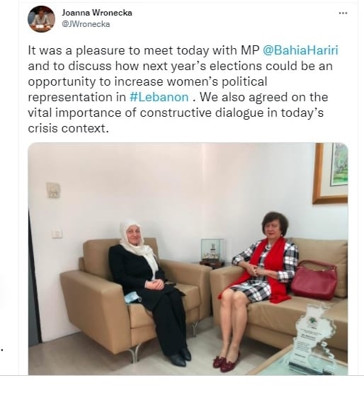 تغريدة للمنسقة الخاصة للأمم المتحدة جوانا فرونيكا عن لقائها بهية الحريري : لجعل الإنتخابات فرصة لزيادة التمثيل السياسي للمرأة في لبنان