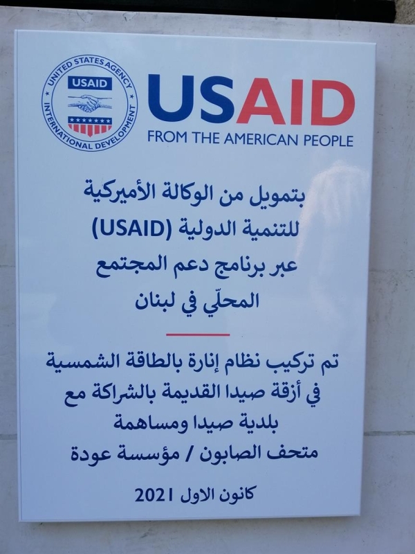 أعلنت بلدية صيداعن إنارة أحد الشوارع التراثية في صيدا القديمة (حي الشارع) بالطاقة الشمسية ، وذلك بتمويل من الوكالة الأميركية للتنمية الدولية USAID ) ) عبر برنامج دعم المجتمع المحلي في لبنان، حيث تم المشروع بالشراكة مع البلدية وبمساهمة من مؤسسة عوده(متحف الصابون) .