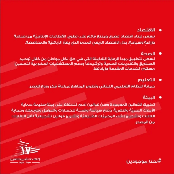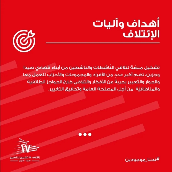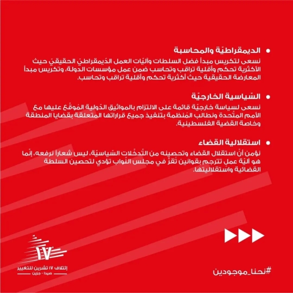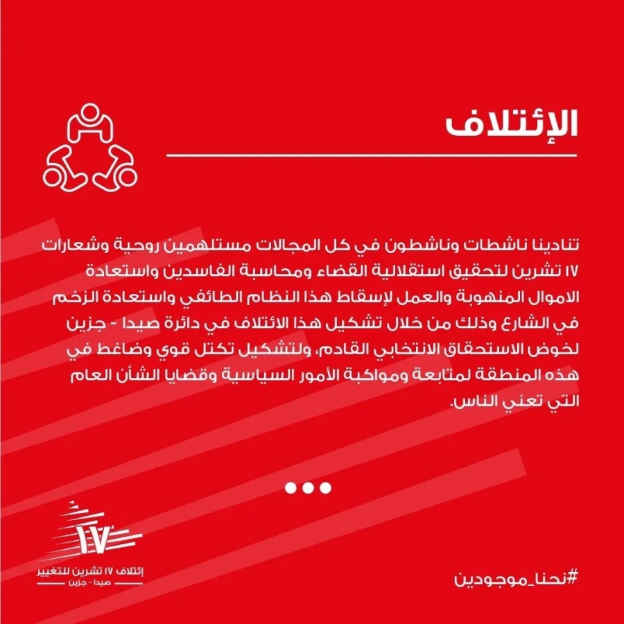 أخيرا اتفق ثوار ١٧ تشرين في صيدا على مبادئ البرنامج الانتخابي في صيدا وجزين. هذا العمل الجيد يعتبر بداية التغيير من خلال إطلاق منصة على وسائل التواصل الاجتماعي لبرنامجهم. وهذه أسماء المجموعات الثورية المشاركة.