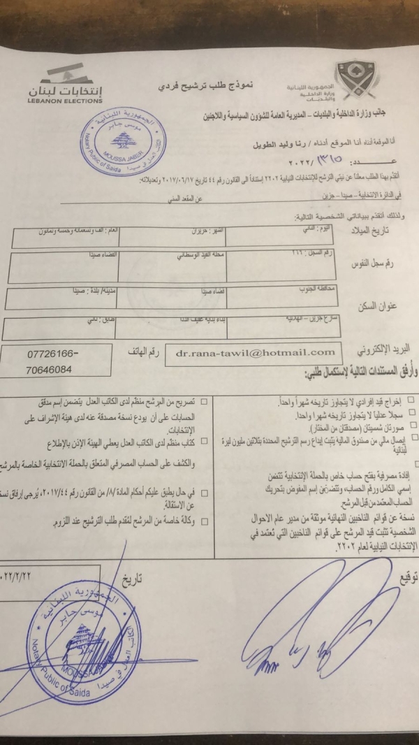 اول ترشيح رسمي لرنا وليد الطويل مرشحة عن دائرة صيدا جزين