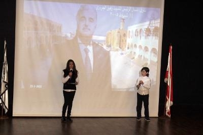 ثم جرى عرض فيديو يحكي بالصور مسيرة الرئيس الشهيد ، توالى بعدها الطلاب صباح عجلوني وأنور أبو هدوي وكريم بسيوني وليا بلولي ولين نوفل وأمجد عجرم ومالك الداعوق وميرا الدرة على القاء كلمات وأبيات شعرية مهداة لروح الرئيس الشهيد . وتولى الاشراف على الأداء اللغوي للطلاب منسقة اللغة العربية الأستاذة سحر عنتر .