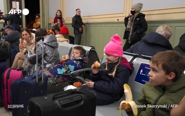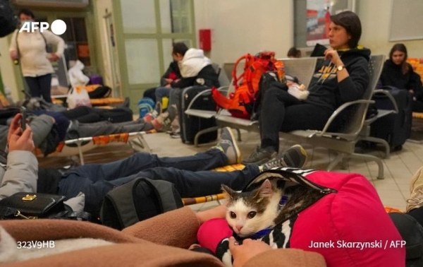 بالصور أمضى لاجئون أوكرانيون غالبيتهم من النساء والأطفال ليلتهم في محطة للقطارات
