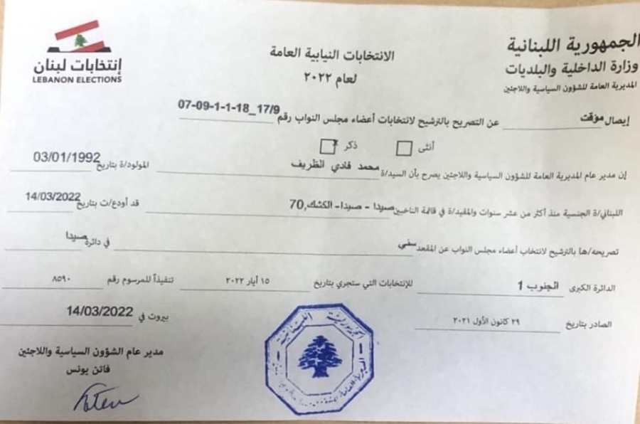 محمد فادي الظريف مرشح عن دائرة الجنوب الأولى صيدا - جزين