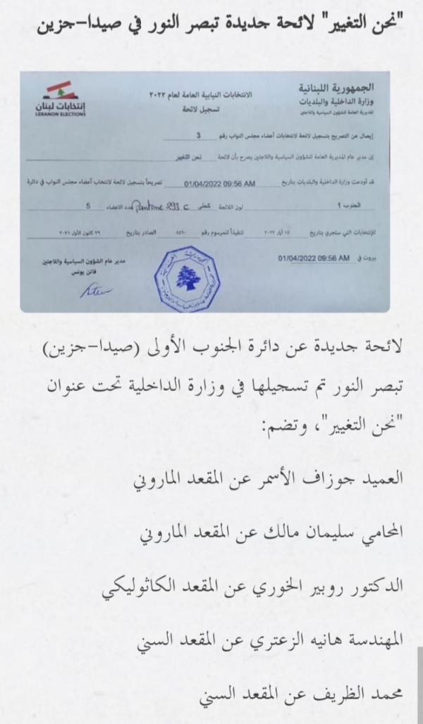 تسجيل اللائحة الثالثة في دائرة الجنوب الأولى صيدا -جزين بإسم "نحنا التغيير"
