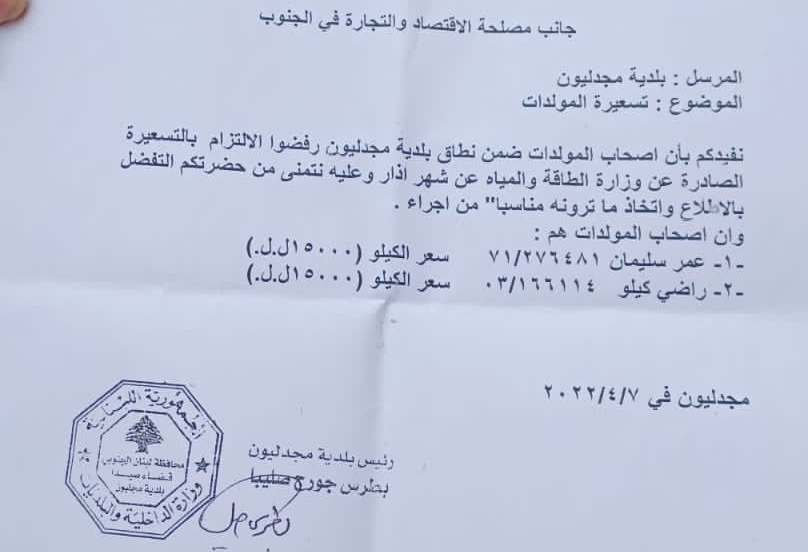 تقدمت بلدية مجدليون بشكوى إلى مصلحة الاقتصاد والتجارة في الجنوب بحق أصحاب المولدات المدعوين: عمر سليمان وراضي كيلو بتاريخ 7 نسيان الجاري، وذلك على خلفية تسعيرهما للكيلو الواط بـ 15000 ليرة لبنانية وعدم الالتزام بتسعيرة وزارة الاقتصاد.