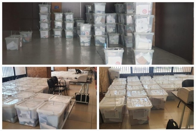 ووضعت الصناديق داخل باحة سرايا صيدا الداخلية حيث يتم تنظيمها تبعاً للمناطق والقرى التي توزع فيها رؤساء الاقلام والكتبة ومساعديهم ، الصناديق المقفلة باسلاك وشرائط بلاستيكية مزودة بكل لوازم رئيس القلم ومساعده اثناء إدارتهما العملية الانتخابية النيابية التي ستجري بعد غد الاحد ، من لوائح شطب ومحاضر وقرطاسية وحبر ووثائق ارشادية والات انارة وكمامات وزي الانتخابات الخاص بهما .