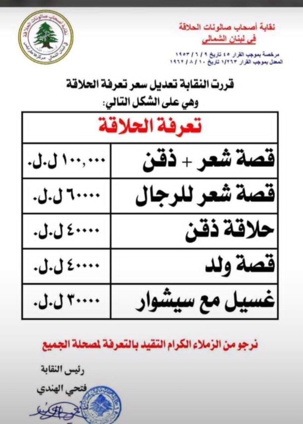 بالتزامن مع ارتفاع سعر صرف الدولار في السوق الموازية، صدر عن نقابة اصحاب صالونات الحلاقة في لبنان تسعيرة جديدة جاءت على الشكل التالي: