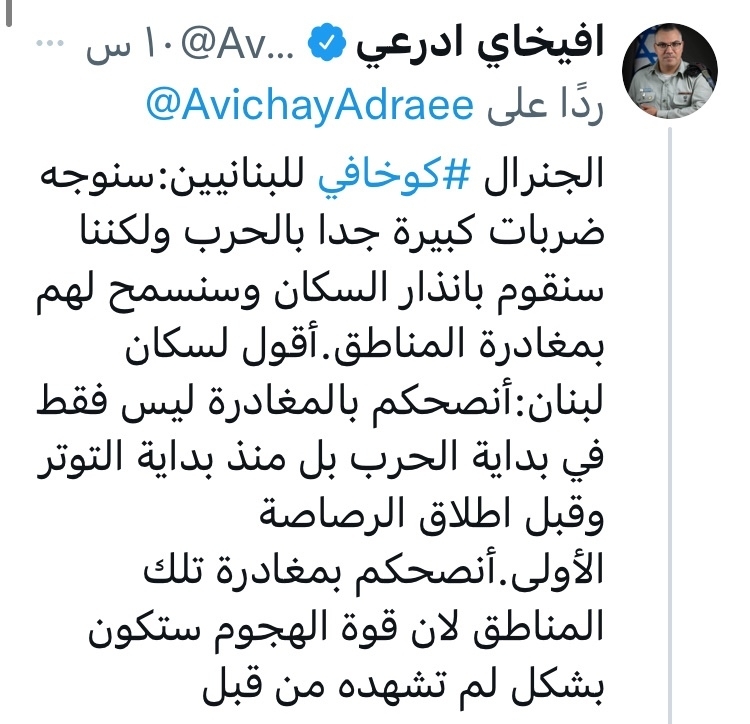 وتوجّه الجنرال كوخافي, الى اللبنانيين بالقول: "سنوجه ضربات كبيرة جدا بالحرب ولكننا سنقوم بانذار السكان وسنسمح لهم بمغادرة المناطق