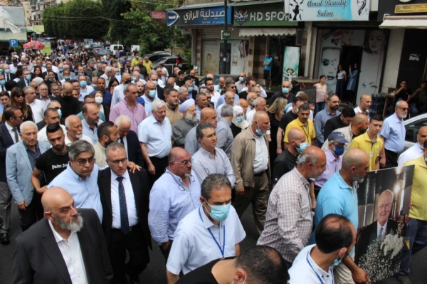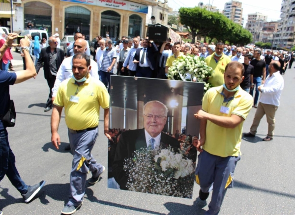 ثم انطلق موكب التشييع سيراً على الأقدام من باحة المستشفى خلف سيارة اسعاف تحمل نعش الراحل، وتتقدمه صورته واكاليل من الزهر من بينها اكليلان باسم الرئيس الحريري والسيدة الحريري .واخترق موكب التشييع الشارع المحاذي للمستشفى ومنه الى ساحة القدس ، وشارع النجاصة .