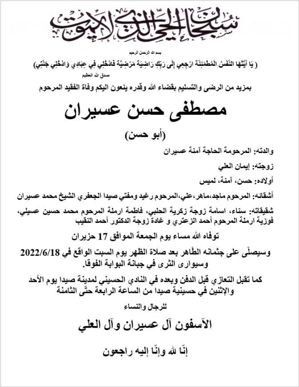 وفاة *والد المفتي الشيخ محمد عسيران الحاج حسن
