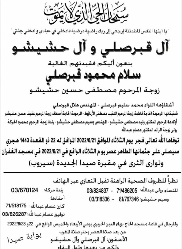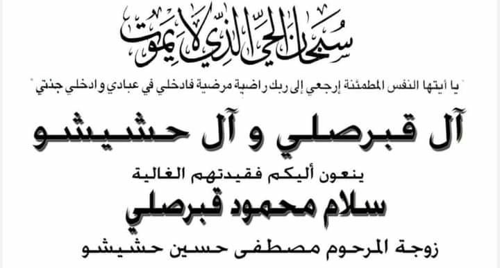 شكر وعرفان لكل من شارك في عزاء والدة القاضي زاهر حمادة