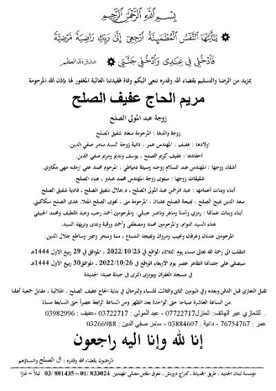 نعي المرحومة مريم الحاج عفيف الصلح