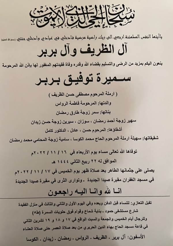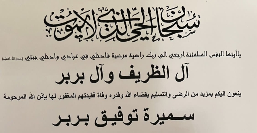 شكر وعرفان لكل من شارك في عزاء والدة القاضي زاهر حمادة