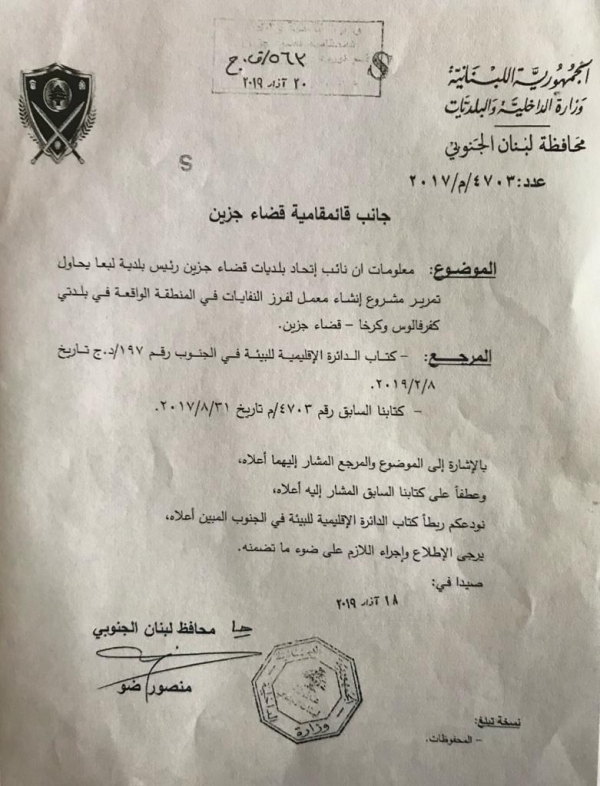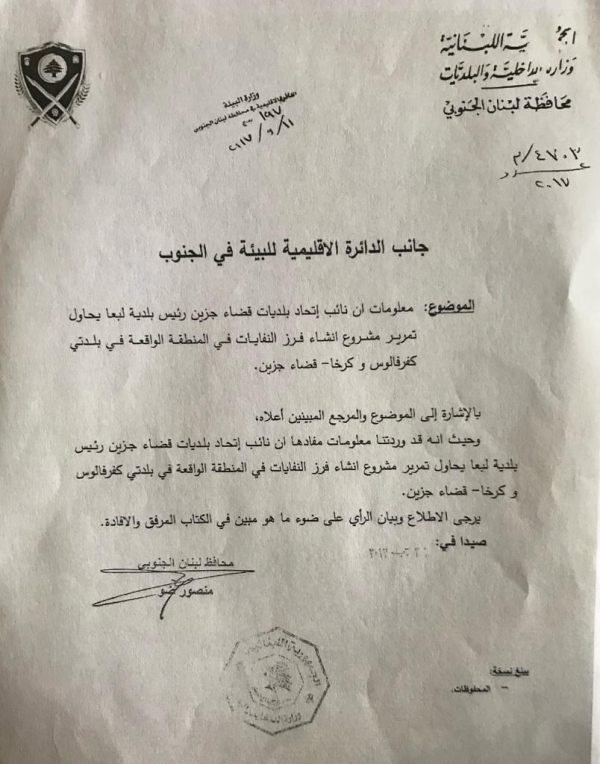 وتؤكد هذه المعلومات مراسلات رسمية من بينها كتاب موجه من محافظ لبنان الجنوبي الى الدائرة الإقليمية للبيئة في الجنوب التي ردت بكتاب رسمي بهذا الخصوص ، وكتاب آخر من المحافظ الى قائمقامية جزين مرفقا بكتاب البيئة (مرفقة ) .