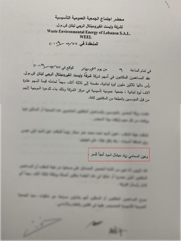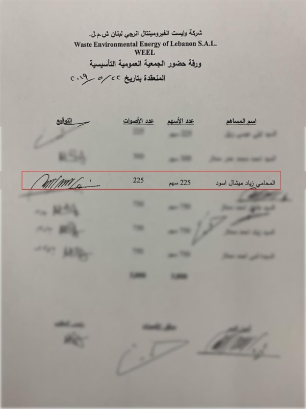 وتساءلت هذه المصادر عما اذا كان من قبيل المصادفة تزامن هذه الحملة أيضاً مع " تأسيس شركة مساهمة بإسم " وايست انفيرومينتال انرجي لبنان ش.م.ل. – Waste Enviromental Energy of Lebanon S.A.L. WEEL " والتي من ضمن مهامها معالجة النفايات، وان يكون من بين المساهمين فيها النائب السابق زياد أسود الذي يستمر في ممارساته التي افقدته مقعده النيابي !.