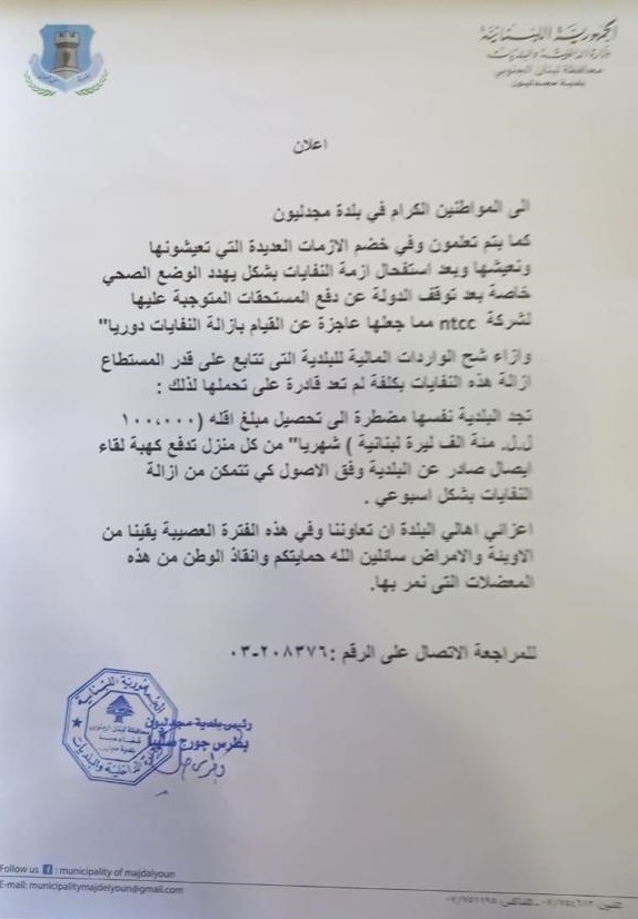 جاء في البيان: "إلى المُواطنين الكرام في بلدة مجدليون، في خضم الأزمات العديدة التي تعيشونها ونعيشها، وبعد استفحال ازمه النفايات بشكل يُهدد الوضع الصحي، خاصة بعد توقف الدولة عن دفع المُستحقات المُتوجبة عليها إلى شركة NTCC، ما جعلها عاجزة عن القيام بإزالة النفايات دورياً، وإزاء شح الواردات المالية للبلدية، التي تُتابع على قدر المُستطاع، إزالة هذه النفايات بكلفة لم تعد قادرة على تحملها، لذلك تجد البلدية نفسها مُضطرة إلى تحصيل مبلغ أقله 100 ألف ليرة لبنانية، شهرياً من كل منزل، تُدفع كهبة، لقاء إيصال صادر عن البلدية، وفق الأصول، كي تتمكن من إزالة النفايات بشكل أسبوعي".