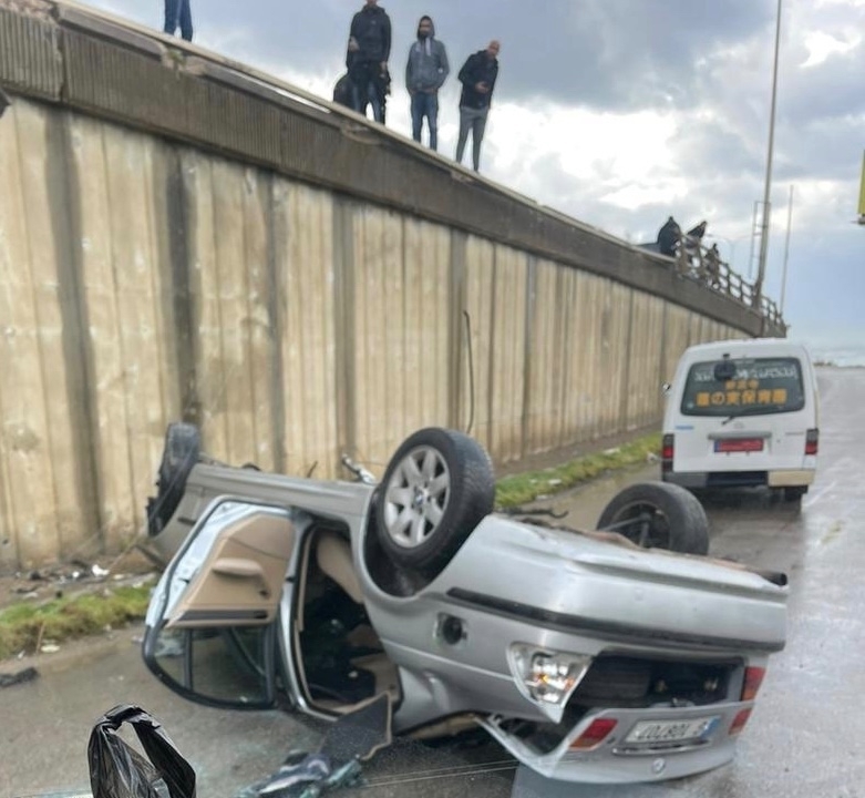 إنقلبت سيارة من فوق جسر الأولي عند المدخل الشمالي لمدينة صيدا الى الطريق الفرعية اسفل الجسر، حيث استقرت على ظهرها مما أدى الى سقوط جريحين.