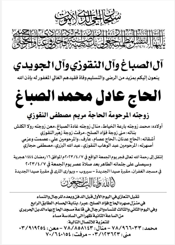 شكر وعرفان لكل من شارك في عزاء والدة القاضي زاهر حمادة
