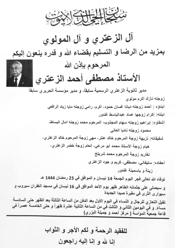 بخالص العزاء والمواساة لعائلة الزعتري وعائلة المولوي وأنسبائهم الكرام بوفاة المغفور له بإذن الله ,المربي الفاضل الأستاذ مصطفى الزعتري