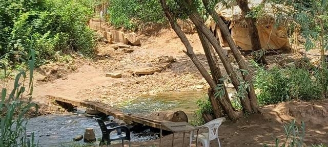 معبر «الشركة المتحدة جسر متحرك محاط بعدة كراس مع خيمة على الضفة السورية لمجرى النهر