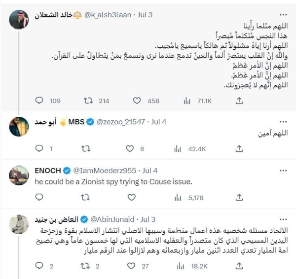 وخلال حديثه واستعراضه بانه يفتح القرآن على سورة "المؤمنون" أكد بأنه متواجد بالمملكة العربية السعودية، مطلقا إهانة بحق النبي صلى الله عليه وسلم.