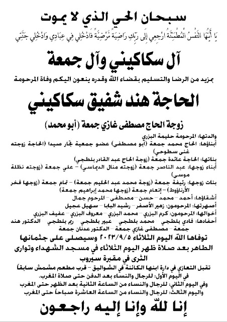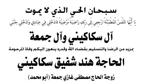 شكر وعرفان لكل من شارك في عزاء والدة القاضي زاهر حمادة