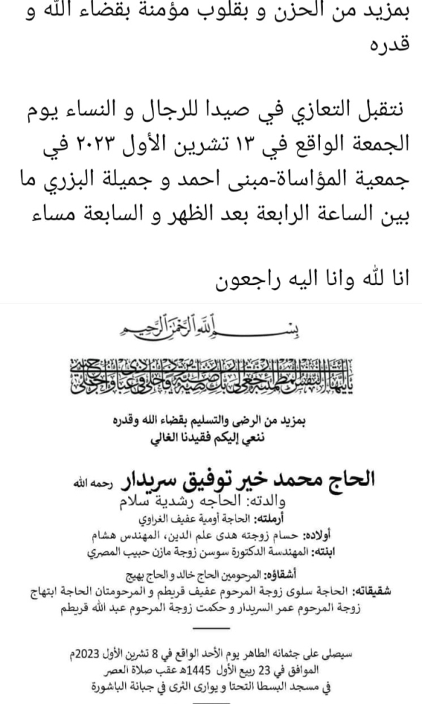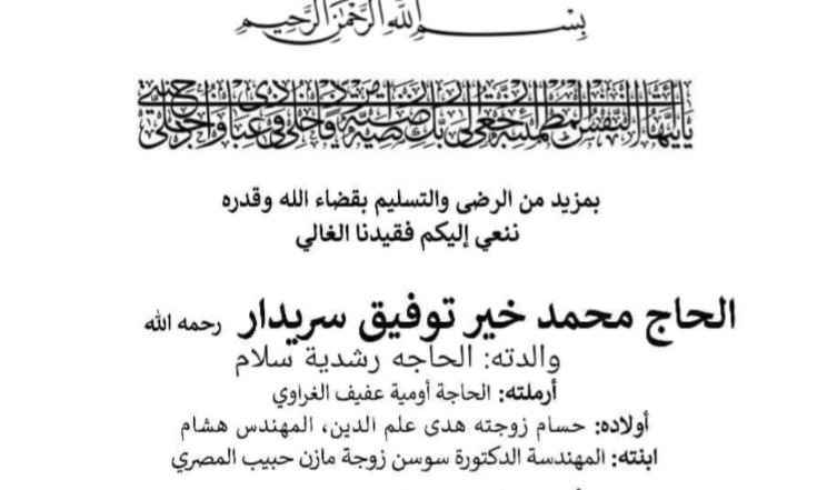 وفاة الحاج محمد توفيق سيريدار