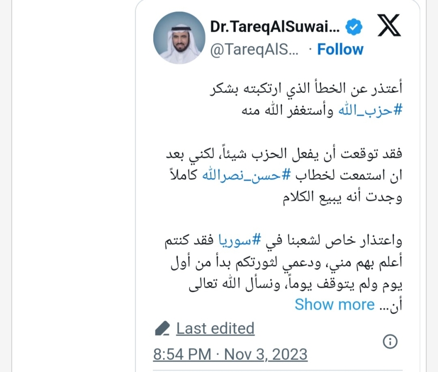 وكتب السويدان في منشور على حسابه عبر منصة "اكس": "أعتذر عن الخطأ الذي ارتكبته بشكر حزب الله وأستغفر الله منه.. فقد توقعت أن يفعل الحزب شيئاً، لكني بعد ان استمعت لخطاب حسن نصرالله كاملاً وجدت أنه يبيع الكلام.. واعتذار خاص لشعبنا في سوريا فقد كنتم أعلم بهم مني، ودعمي لثورتكم بدأ من أول يوم ولم يتوقف يوماً، ونسأل الله تعالى أن يخلصكم من حكم الطاغية بشار وأعوانه".