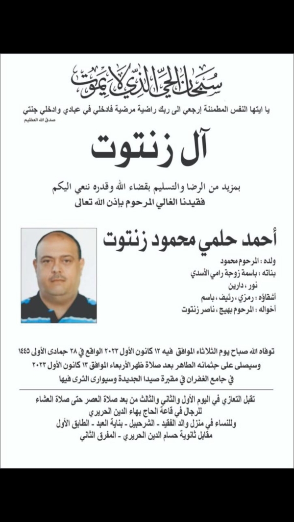 شكر وعرفان لكل من شارك في عزاء والدة القاضي زاهر حمادة