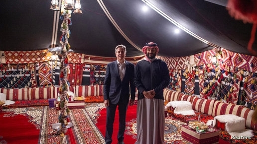ولي العهد السعودي خلال استقباله وزير الخارجية الأميركي بمدينة العلا