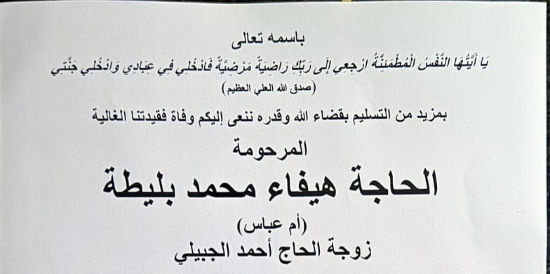شكر وعرفان لكل من شارك في عزاء والدة القاضي زاهر حمادة