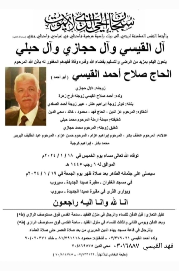 شكر وعرفان لكل من شارك في عزاء والدة القاضي زاهر حمادة