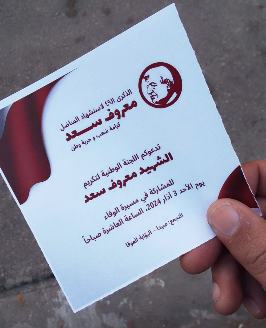 كما دعا التنظيم الشعبي الناصري إلى أوسع مشاركة في مسيرة الوفاء للشهيد معروف سعد تأكيداً على نهجه الوطني العروبي الرافض للطائفية والمذهبية، وذلك يوم الأحد 3 آذار 2024، العاشرة صباحاً، انطلاقاً من البوابة الفوقا – صيدا - قرب تمثال الشهيد معروف
