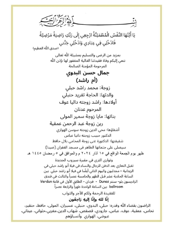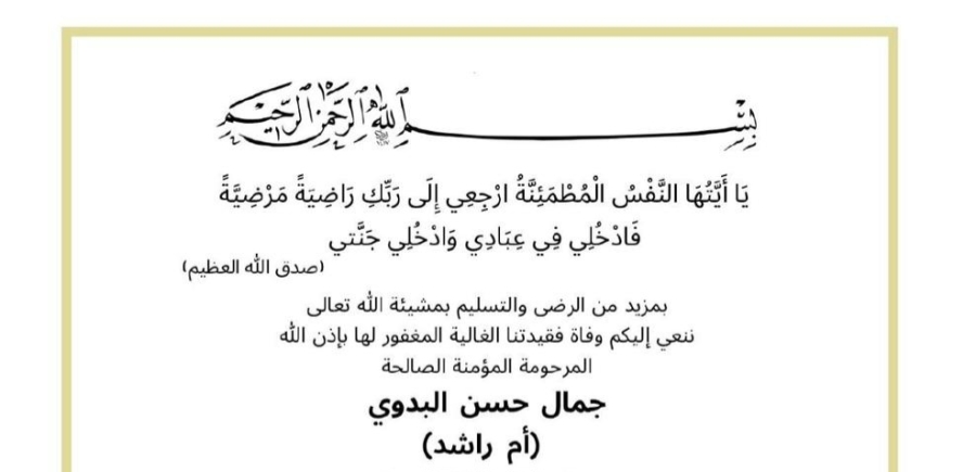 شكر وعرفان لكل من شارك في عزاء والدة القاضي زاهر حمادة