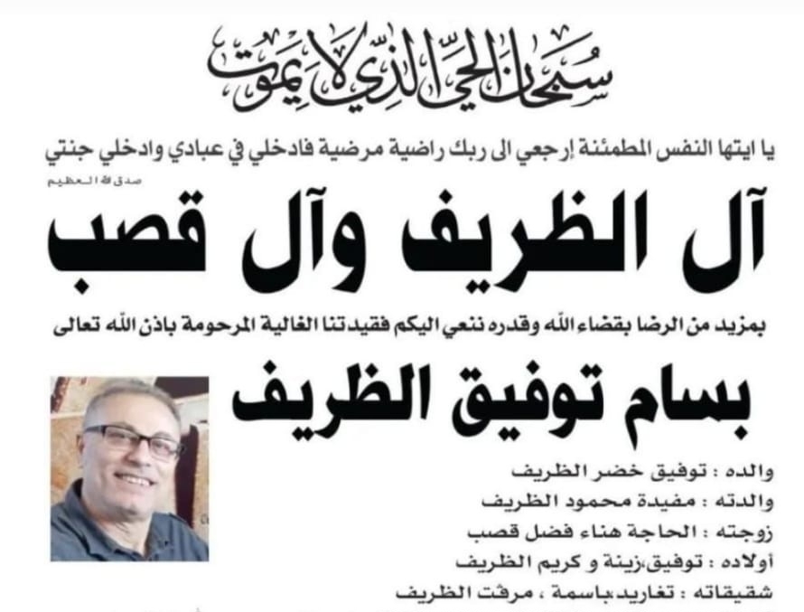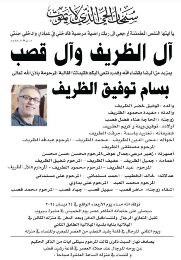 بمزيد من التسليم بقضاء الله وقدره، ينعي رئيس وأعضاء المجلس الإداري وموظفو مكتب جمعية المقاصد الخيرية الإسلامية في صيدا الأخ بسام توفيق الظريف رحمه الله، الذي غيبه الموت بعد مسيرة طويلة من العطاء المهني في خدمة رسالة المقاصد، بدأها في سن مبكرة واستمرت على مدى أكثر من أربعة عقود، في أدقّ وأحلك الظروف التي مرت بها الجمعية والوطن على حدّ سواء.