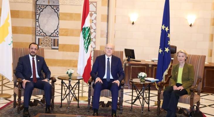 ميقاتي الى انه "خصصنا القسم الاكبر من الاجتماع لبحث ملف النازحين السوريين الموجودين على الأراضي اللبنانية والتعاون بين لبنان وقبرص ودول الاتحاد الاوروبي لمعالجة هذا الملف وتداعياته المباشرة وغير المباشرة، وفي هذا الاطار عبرّنا أولا عن تقديرنا لتفهّم بعض دول الاتحاد الاوروبي في اجتماعه الأخير لطلب الحكومة اللبنانية،اعادة النظر في سياسات الاتحاد الاوروبي المتعلقة بادارة ازمة النازحين السوريين في لبنان. وهذا الموقف يترجم بزيارة فخامة الرئيس والسيدة رئيسة المفوضية الأوروبية".اشارت رئيسة المفوضية الأوروبية أورسولا فون دير لاين، خلال مؤتمر صحافي في السراي الحكومي مع رئيس حكومة تصريف الاعمال نجيب ميقاتي و الرّئيس القبرصي نيكوس خريستودوليدس، الى ان "لبنان بلد جميل ومتنوع إلا أنّه يواجه تحديات كبيرة محلياً نتيجة للتوترات والحرب في المنطقة"، مضيفة :"للتأكيد على دعمنا أودُّ أن أعلن عن حزمة مالية بقيمة مليار يورو للبنان ستكون متاحة اعتباراً من السنة الجارية وحتى عام 2027".