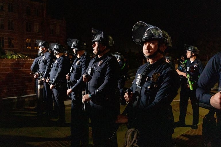 وتجمع مئات من أفراد الشرطة وهم يرتدون خوذات واقية في حرم جامعة كاليفورنيا في لوس أنجلوس بالولايات المتحدة منذ حلول الظلام أمس الأربعاء استعدادا لإزالة مخيم احتجاج مؤيد للفلسطينيين هاجمه مؤيدون لإسرائيل في الليلة السابقة.