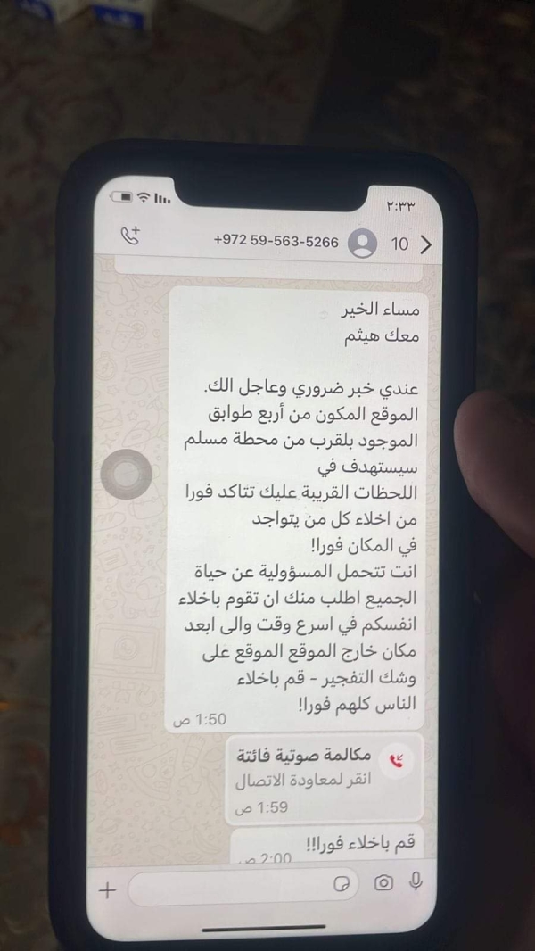 أفادت "الجديد"، اليوم الاثنين، عن "وصول رسالة عبر تطبيق واتساب، فجراّ إلى احد المواطنين في بلدة البازورية، قضاء صور، تطلب منه بإخلاء السكان من مبنى مؤلف من اربع طبقات قرب محطة للمحروقات، وأن المبنى على وشك التفجير".